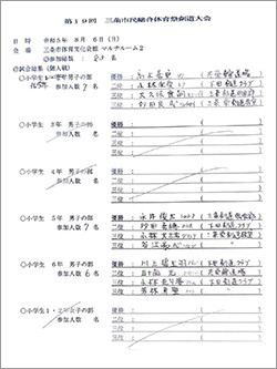 第19回市民総合体育祭剣道大会 令和5年8月6日 会場:三条市体育文化会館 第19回市民総合体育祭剣道大会成績 第19回市民総合体育祭剣道大会成績のダウンロード↓ 第19回市民総合体育祭剣道大会結果のダウンロード↓ 第19回市民総合体育祭剣道大会【優勝者】 部門 氏名 所属 小学生低学年男子の部 高木蒼空 共栄館道場 小学生5年男子の部 永井俊太 三条剣道倶楽部 小学生6年男子の部 川上碧生羽 下田剣道クラブ 小学生低学年女子の部 小林美蘭 下田剣道クラブ 小学生高学年女子の部 相場結妃香 共栄館道場 中学生男子の部 神子島史葵 本成寺中学校 中学生女子の部 大崎優菜 下田中学校 高校生男子の部 味田一輝 三条高校 高校生女子の部 大竹結子 三条高校 一般の部 石丸将也 (敬称略) 第19回市民総合体育祭剣道大会ギャラリー
