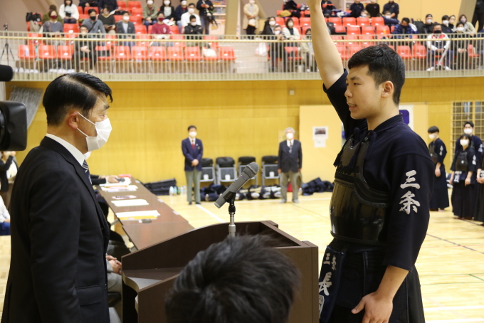第48回三条杯争奪高等学校剣道大会 開催日:令和5年4月30日 会場:三条市体育文化会館 主催:三条剣道会 第48回三条杯剣道大会結果 三条杯剣道大会トーナメント表 第48回三条杯トーナメント表、準決勝・決勝結果のダウンロード↓ 第48回三条杯剣道大会成績 第48回三条杯剣道大会成績、優秀選手賞のダウンロード↓ 第48回三条杯剣道大会ギャラリー 開会式 [女子1回戦]三条東-東海大甲府 [女子1回戦]三条-聖光学院 [女子2回戦]五泉-弘前実業 [男子1回戦]三条東-松商学園 [男子1回戦]三条-富山工業 [男子準々決勝]帝京長岡-取手第一 [女子準決勝]日本航空-健大高崎 [女子準決勝]白河-山形東 [男子準決勝]土浦日大-龍谷富山 [男子準決勝]取手第一-小山 [女子決勝]健大高崎-白河 [男子決勝]土浦日大-小山 表彰式